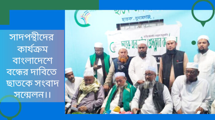 ছাতকে সাদপন্থীদের অপতৎপরতা বন্ধের দাবিতে সংবাদ সম্মেলন করেছেন উপজেলার সাধারণ মুসলিম জনতা ও সর্বস্তরের উলামাবৃন্দ। সংবাদ সম্মেলনে বক্তব্য পাঠ করেন জাউয়াবাজার জামে মসজিদের ইমাম ও খতিব হাফিজ মাওলানা সাইদ আহমদ, বক্তব্য রাখেন মাওলানা ফজলুর রহমান।
