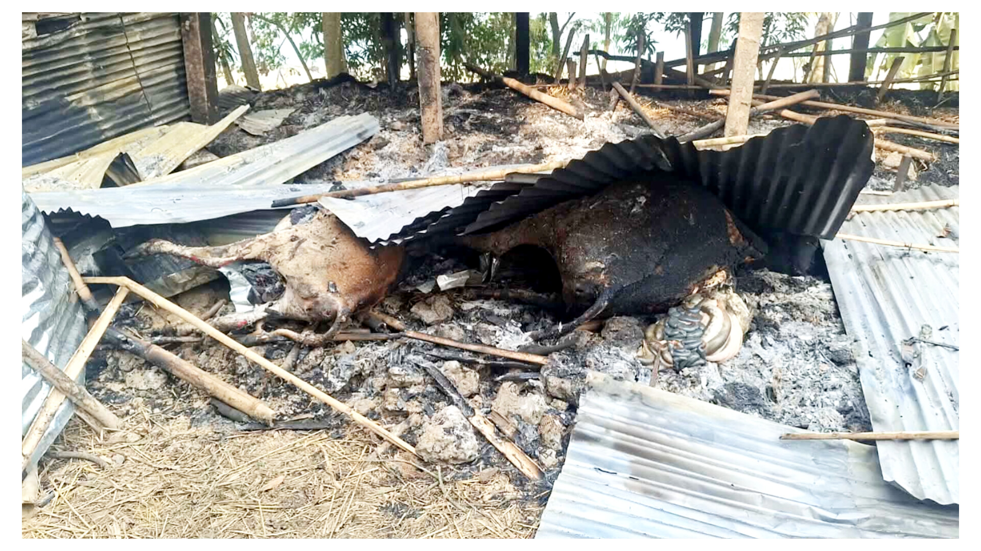 ওসমান গণিসহ স্থানীয়দের দাবি, ছোট-বড় মিলিয়ে তার খামারে ৫০টি গরু, ৫০০ হাঁস ও ১০টি ভেড়া ছিল। ৭টি গরু পুড়ে মারা গেছে। আগুনে ঝলসে আহত অবস্থায় আশেপাশের বিভিন্ন জায়গা থেকে উদ্ধার করা হয়েছে ১০টি। বাকী ৩৩টি গরু ও ভেড়াগুলোর খোঁজ মিলে নি এখনো। হাঁসগুলোও সব পুড়ে গেছে। ধ্বংস স্তুপের মাঝে তাদের কঙ্কাল গুলোই কেবল অবশিষ্ট আছে।